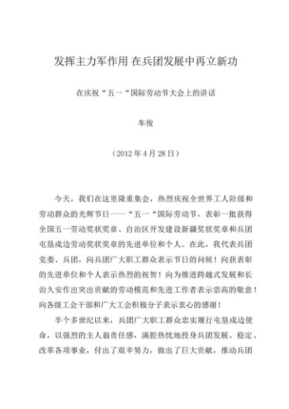 / 时令材料∣0501劳动节:20120428庆祝“五一“国际劳动节大会上的讲话——发挥主力军作用 在兵团发展中再立新功