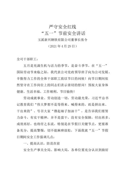 / 时令材料∣0501劳动节:20210429“五一”节前安全工作讲话——玉溪新兴钢铁公司董事长张令