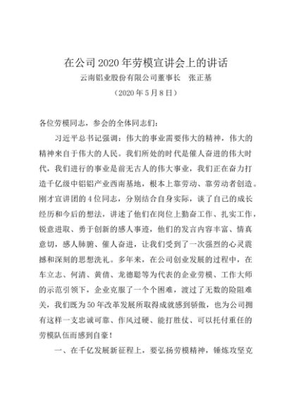 / 时令材料∣0501劳动节:20200508在公司劳模宣讲会上的讲话——云南铝业公司董事长 张正基