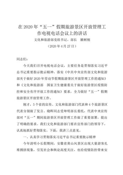 时令材料∣0501劳动节:20200427在“五一”假期旅游景区开放管理工作电视电话会议上的讲话——文旅部部长 雒树刚