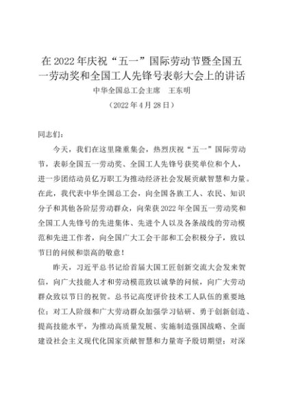 时令材料∣0501劳动节:20220428在2022年庆祝“五一”国际劳动节暨全国五一劳动奖和全国工人先锋号表彰大会上的讲话——全国总工会主席 王东明