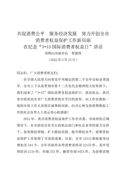 时令材料∣0315消费者日:20220315纪念“3•15国际消费者权益日”讲话——双鸭山市副市长 智建伟