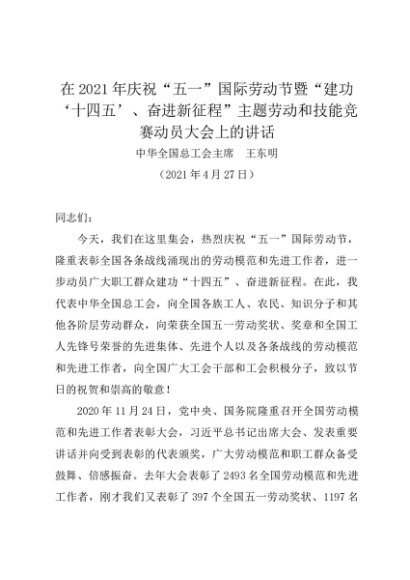 时令材料∣0501劳动节:20210427在2021年庆祝“五一”国际劳动节暨“建功‘十四五’、奋进新征程”主题劳动和技能竞赛动员大会上的讲话——全国总工会主席 王东明