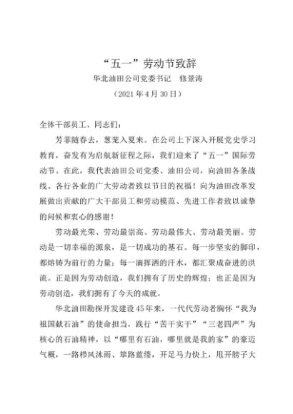 时令材料∣0501劳动节:20210430“五一”劳动节致辞——华北油田公司党委书记 修景涛