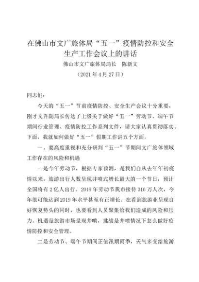 / 时令材料∣0501劳动节:20210427在“五一”疫情防控和安全生产工作会议上的讲话——佛山市文广旅体局局长 陈新文