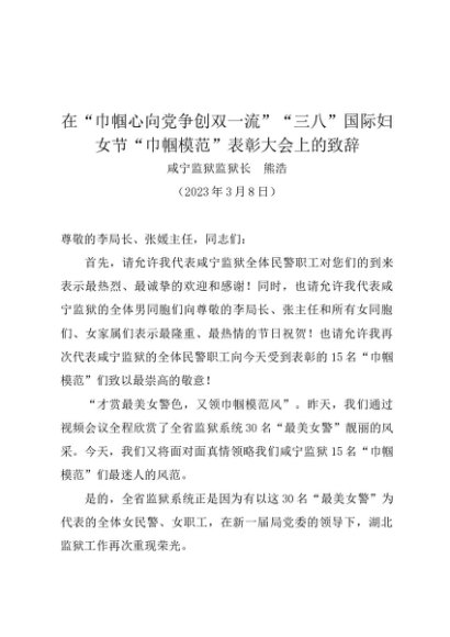 时令材料∣0308妇女节:20230308在“巾帼心向党争创双一流”“三八”国际妇女节“巾帼模范”表彰大会上的致辞——咸宁监狱监狱长 熊浩