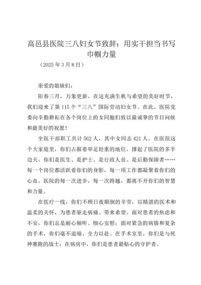 / 时令材料∣0308妇女节:20250308高邑县医院三八妇女节致辞:用实干担当书写巾帼力量