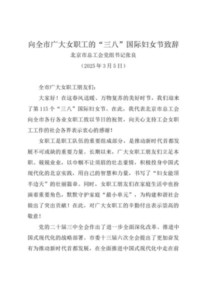 / 时令材料∣0308妇女节:20250308向全市广大女职工的“三八”国际妇女节致辞——北京市总工会党组书记张良
