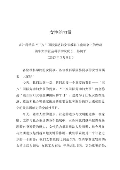 时令材料∣0308妇女节:20230308在社科学院“三八”国际劳动妇女节教职工座谈会上的致辞——清华大学社会科学学院院长 彭凯平