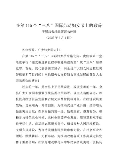 / 时令材料∣0308妇女节:20250308在第115个“三八”国际劳动妇女节上的致辞——平遥县委统战部部长孙博