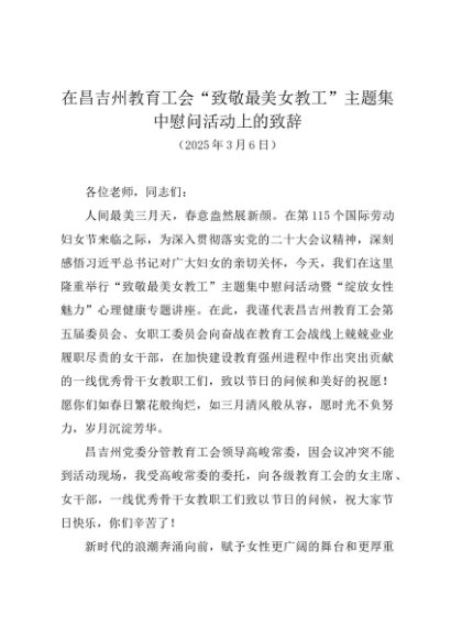 / 时令材料∣0308妇女节:20250308在昌吉州教育工会“致敬最美女教工”主题集中慰问活动上的致辞