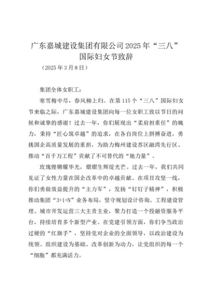 / 时令材料∣0308妇女节:20250308广东嘉城建设集团有限公司2025年“三八”国际妇女节致辞