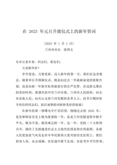 / 时令材料∣0101元旦:20230101在元旦升旗仪式上的新年贺词——兰州市市长张伟文
