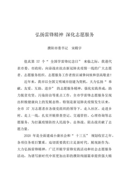 / 时令材料∣0305学雷锋:20200304弘扬雷锋精神 深化志愿服务——濮阳市委书记 宋殿宇