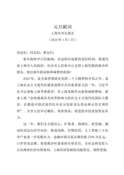 时令材料∣0101元旦:20240101元旦献词——上海市市长龚正