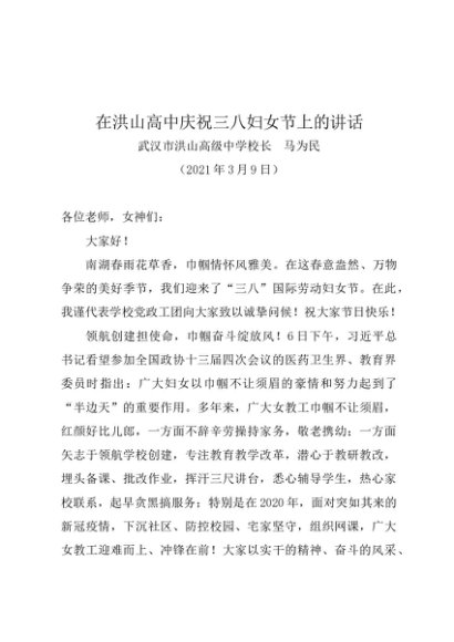 时令材料∣0308妇女节:20210309在洪山高中庆祝三八妇女节上的讲话——武汉市洪山高级中学校长 马为民