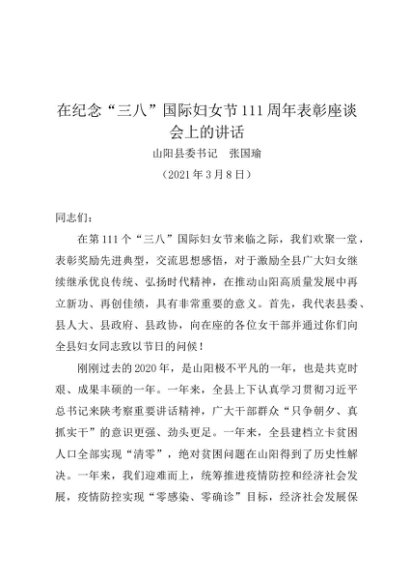 / 时令材料∣0308妇女节:20210308在纪念“三八”国际妇女节111周年表彰座谈会上的讲话——山阳县委书记 张国瑜