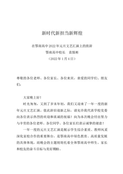 / 时令材料∣0101元旦:20220104在鄂南高中2022年元旦文艺汇演上的致辞——鄂南高中校长 袁慎彬