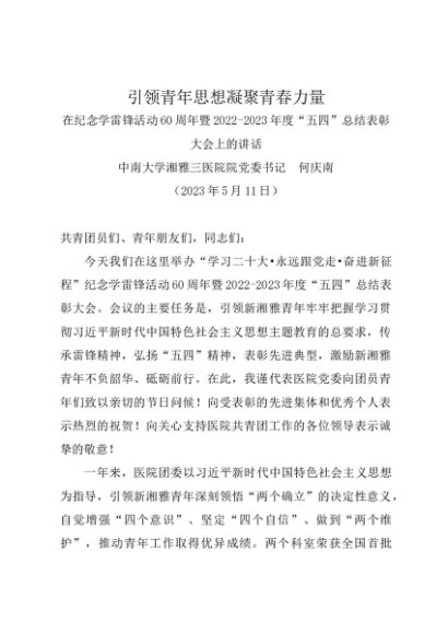 时令材料∣0305学雷锋:20230511在纪念学雷锋活动60周年暨“五四”总结表彰大会上的讲话——中南大学湘雅三医院院党委书记 何庆南