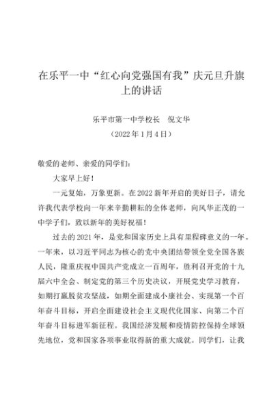 / 时令材料∣0101元旦:20220104在乐平一中红心向党强国有我庆元旦升旗上的讲话——乐平市第一中学校长倪文华