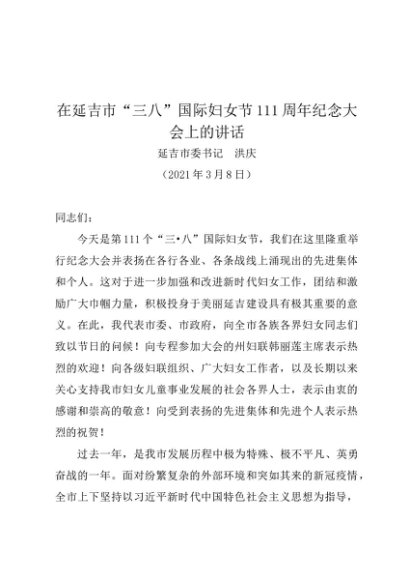 / 时令材料∣0308妇女节:20210308在延吉市“三八”国际妇女节111周年纪念大会上的讲话——延吉市委书记 洪庆