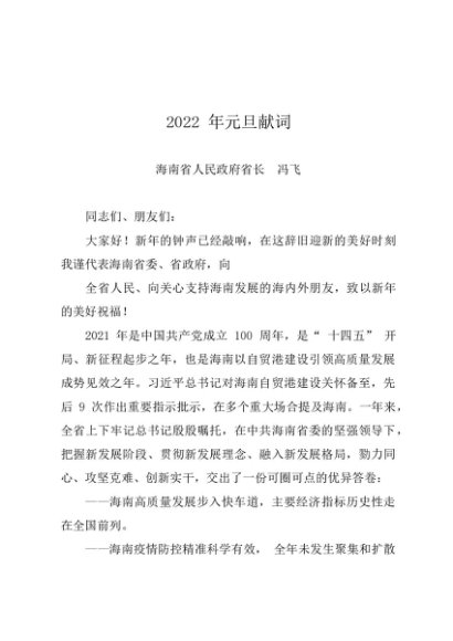 时令材料∣0101元旦:2022 0101元旦献词——海南省人民政府省长冯飞