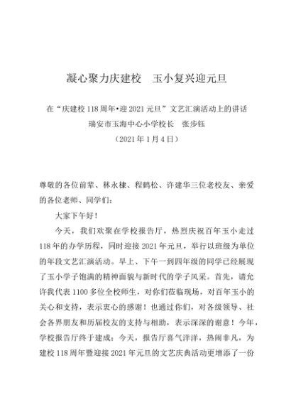 时令材料∣0101元旦:20210104在庆建校118周年•迎2021元旦文艺汇演活动上的讲话——瑞安市玉海中心小学校长张步钰