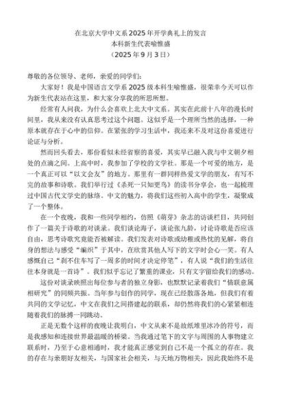 / 本科新生代表喻惟盛:在北京大学中文系2025年开学典礼上的发言