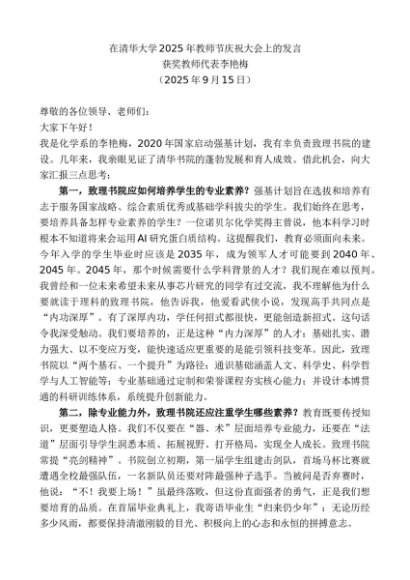 / 获奖教师代表李艳梅:在清华大学2025年教师节庆祝大会上的发言
