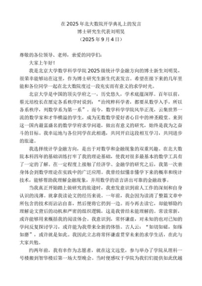 / 博士研究生代表刘明昊:在2025年北大数院开学典礼上的发言