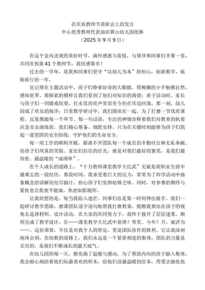 / 中心优秀教师代表油田黄山幼儿园张琳:在庆祝教师节表彰会上的发言
