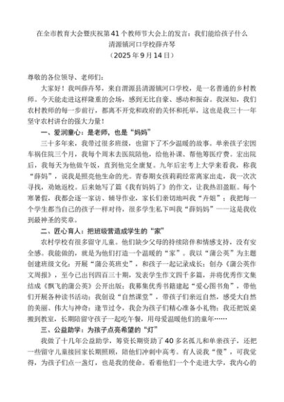 / 清源镇河口学校薛卉琴:在全市教育大会暨庆祝第41个教师节大会上的发言:我们能给孩子什么