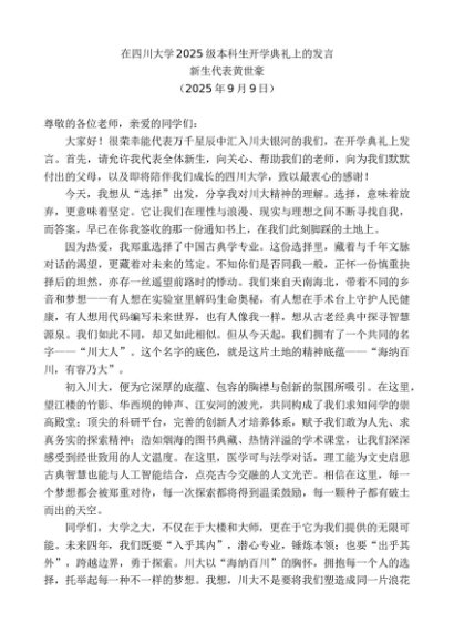 / 新生代表黄世豪:在四川大学2025级本科生开学典礼上的发言