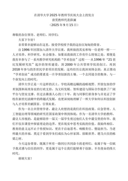 / 获奖教师代表薛澜:在清华大学2025年教师节庆祝大会上的发言