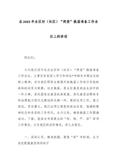 / 在2025年全区村(社区)“两委”换届准备工作会议上的讲话