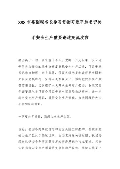 / XXX市委副秘书长学习贯彻习近平总书记关于安全生产重要论述交流发言