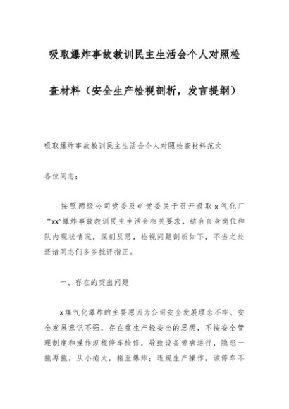 / 吸取爆炸事故教训民主生活会个人对照检查材料(安全生产检视剖析,发言提纲)