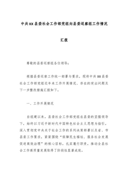 / 中共XX县委社会工作部党组向县委巡察组工作情况汇报
