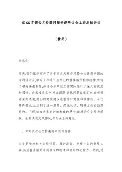 / 在XX支部公文抄袭问题专题研讨会上的总结讲话(精品)