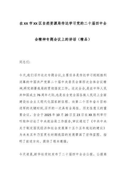 / 在XX市XX区自然资源局传达学习党的二十届四中全会精神专题会议上的讲话(精品)