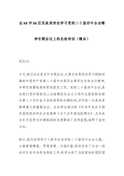 / 在XX市XX区民政局传达学习党的二十届四中全会精神专题会议上的总结讲话(精品)