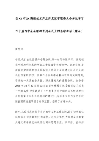 / 在XX市XX高新技术产业开发区管理委员会传达学习二十届四中全会精神专题会议上的总结讲话(精品)