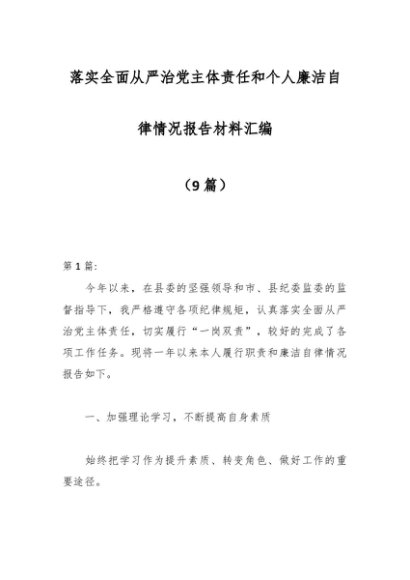 / (9篇)落实全面从严治党主体责任和个人廉洁自律情况报告材料汇编