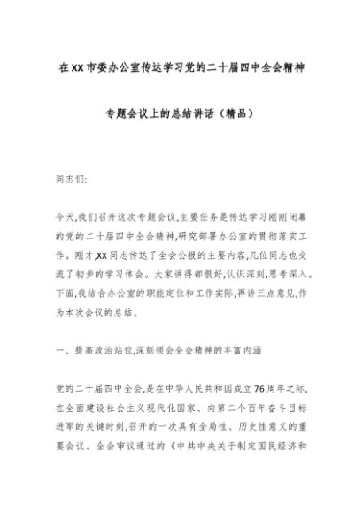 / 在XX市委办公室传达学习党的二十届四中全会精神专题会议上的总结讲话(精品)