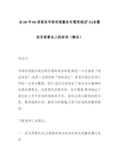 / 在XX市XX局落实市委巡视整改专题党委(扩大)会暨动员部署会上的讲话(精品)