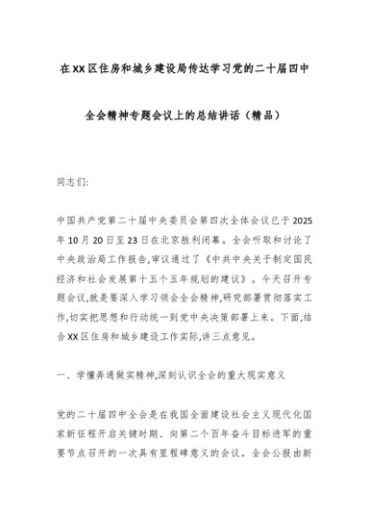 / 在XX区住房和城乡建设局传达学习党的二十届四中全会精神专题会议上的总结讲话(精品)