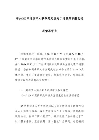 / 中共XX市退役军人事务局党组关于巡察集中整改进展情况报告