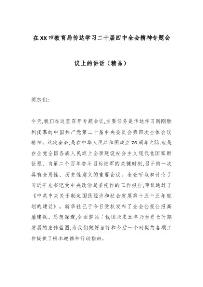 / 在XX市教育局传达学习二十届四中全会精神专题会议上的讲话(精品)
