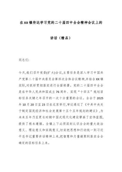 / 在XX镇传达学习党的二十届四中全会精神会议上的讲话(精品)