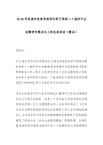 / 在XX市发展和改革系统传达学习党的二十届四中全会精神专题会议上的总结讲话(精品)